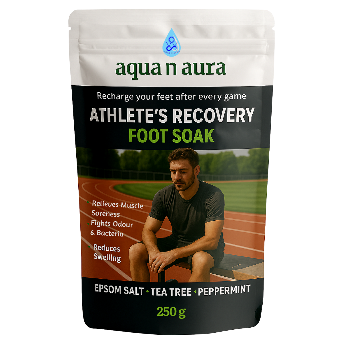 Recharge your feet with aqua n aura Athlete’s Recovery Foot Soak – a refreshing blend of Epsom Salt, Tea Tree, and Peppermint. Specially created for athletes and active individuals, this foot soak provides a soothing and calming experience after sports, running, workouts, or a long day on your feet. The natural ingredients help in keeping your feet feeling fresh, relaxed, and odour-free. Simply add the soak to warm water, dip your feet, and enjoy a spa-like experience at home. Perfect for everyday use to maintain clean, comfortable, and refreshed feet.